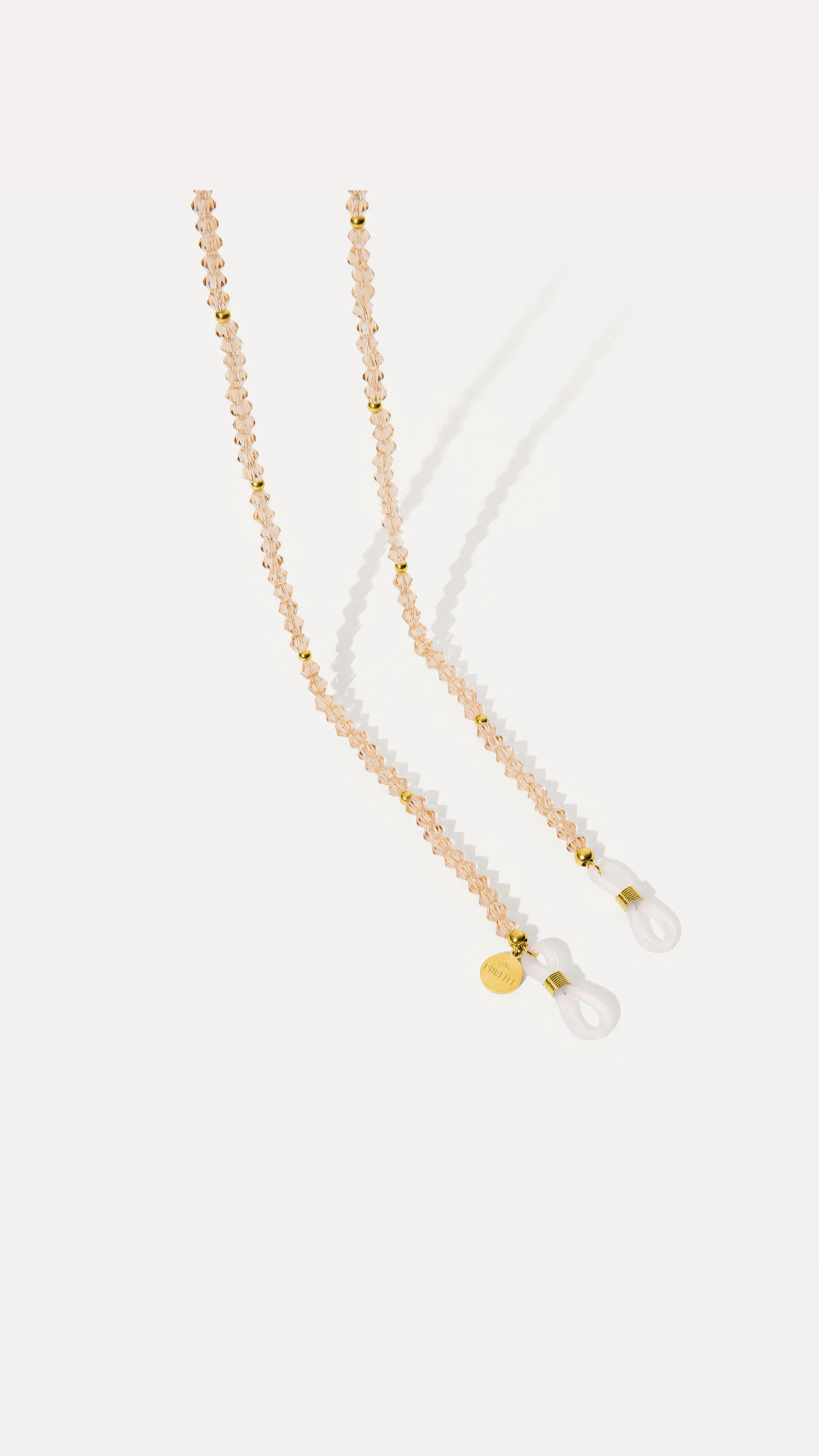 Mit Lulu trägst du nicht nur deine Brille, sondern auch ein Statement aus Leichtigkeit und Eleganz. Die filigrane Brillenkette besteht aus unzähligen kleinen roséfarbenen Steinchen, die im Licht zart schimmern und mit feinen goldenen Details veredelt sind.
